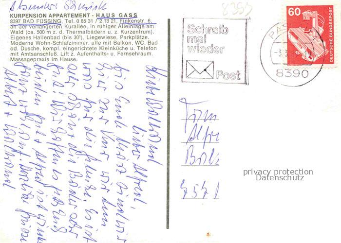 74049564 alte Postkarte BAD FuessING Kurpension Appartement Haus Gass Hallenbad Fremdenzimmer postalisch gelaufen Erhaltung siehe scans [FriedD77] KatCode: 11110009275116
