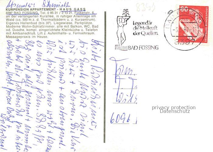 74049565 alte Postkarte BAD FuessING Kurpension Appartement Haus Gass Hallenbad Fremdenzimmer postalisch gelaufen Erhaltung siehe scans [FriedD77] KatCode: 11110009275116