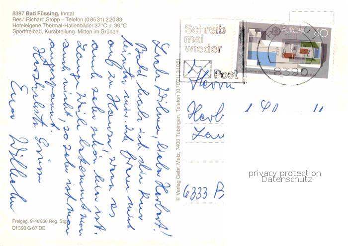 72863568 alte Postkarte Bad Fuessing Park Hotel Park Hallenbad Fliegeraufnahme postalisch gelaufen Erhaltung siehe scans [FriedD77] KatCode: 11110009275116