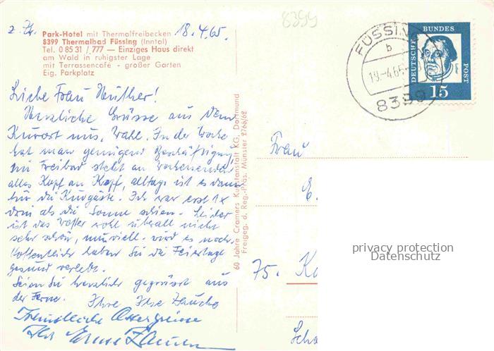 74049576 alte Postkarte BAD FuessING Park-Hotel Thermalfreibecken postalisch gelaufen Fliegeraufnahme Erhaltung siehe scans [FriedD77] KatCode: 11110009275116