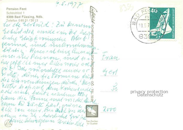 74049553 alte Postkarte BAD FuessING Pension Fent Gastraum Luftaufnahme Thermalkurort postalisch gelaufen Erhaltung siehe scans [FriedD77] KatCode: 11110009275116