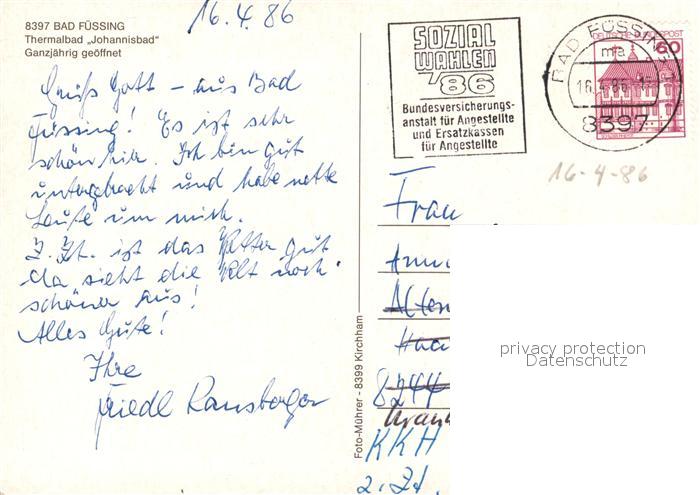 73295161 alte Postkarte Bad Fuessing Thermalbad Johannisbad Details postalisch gelaufen Erhaltung siehe scans [WerneD78] KatCode: 11110009275116