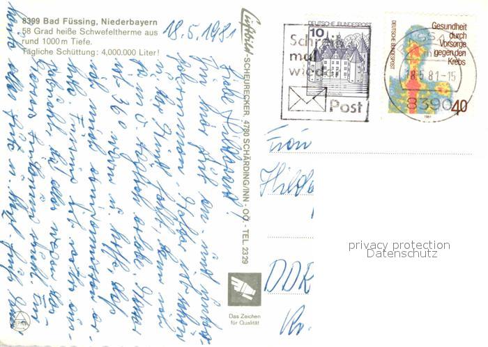 72846254 alte Postkarte Bad Fuessing Thermalbad Schwefeltherme Hotel Bodenschach Statue Fontaene postalisch gelaufen Erhaltung siehe scans [FriedD77] KatCode: 11110009275116