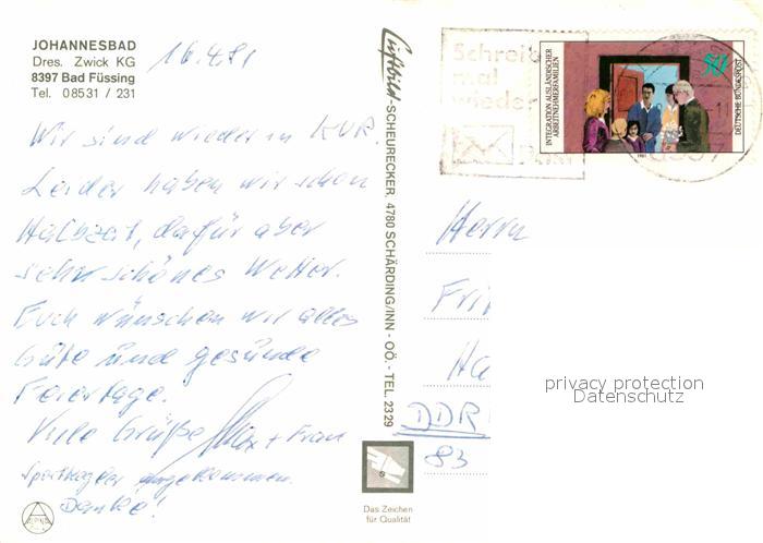 72772185 alte Postkarte Bad Fuessing Therme Johannesbad postalisch gelaufen Erhaltung siehe scans [AndreD76] KatCode: 11110009275116