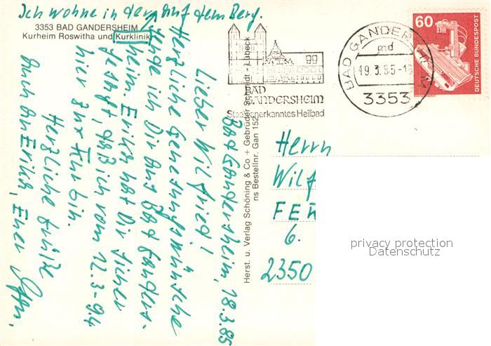 73689645 alte Postkarte Bad Gandersheim Kurheim Roswitha und Kurklinik postalisch gelaufen Erhaltung siehe scans [WerneD78] KatCode: 11110003155001