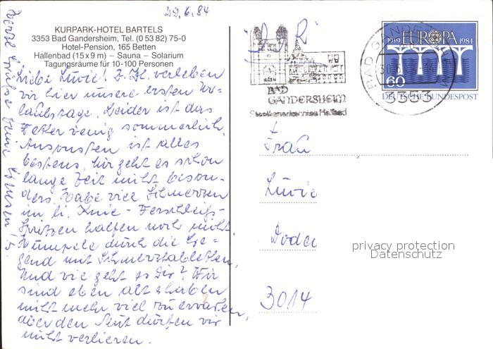 72051127 alte Postkarte Bad Gandersheim Kurpark Hotel Bartels Hallenbad Tagungsraeume Zimmer postalisch gelaufen Erhaltung siehe scans KatCode: 11110003155001