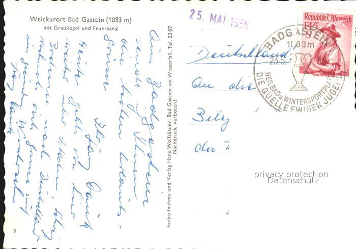 72447189 alte Postkarte Bad Gastein Teilansicht Weltkurort mit Graukogel und Feuersang postalisch gelaufen Erhaltung siehe scans KatCode: 11390322050403