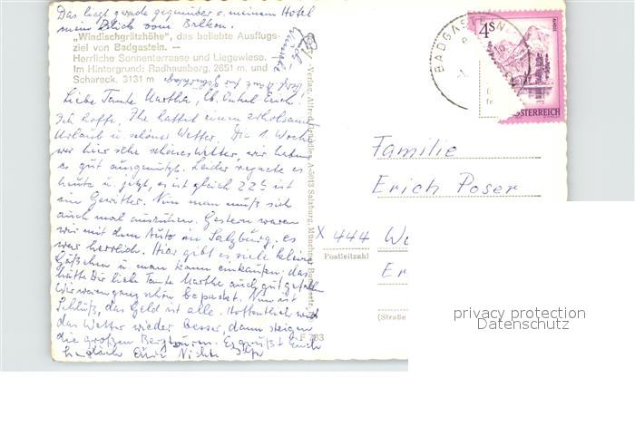 72510579 alte Postkarte Bad Gastein Windischgraetzhoehe postalisch gelaufen Erhaltung siehe scans KatCode: 11390322050403
