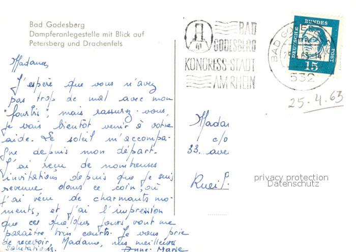 73146750 alte Postkarte Bad Godesberg Dampferanlegestelle mit Blick auf Petersberg und Drachenfels postalisch gelaufen Erhaltung siehe scans [FriedD77] KatCode: 11110005314000