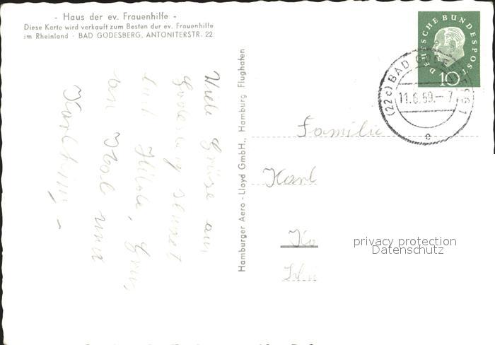 72069743 alte Postkarte Bad Godesberg Haus der ev. Frauenhilfe Fliegeraufnahme postalisch gelaufen Erhaltung siehe scans KatCode: 11110005314000