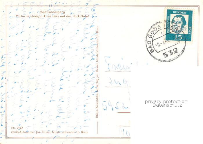 73688417 alte Postkarte Bad Godesberg Partie im Stadtpark mit Blick auf das Parkhotel Wasserspiele postalisch gelaufen Erhaltung siehe scans [FriedD77] KatCode: 11110005314000