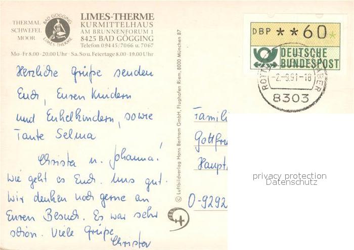 73715188 alte Postkarte Bad Goegging Limestherme Thermal Schwefel Moor Kurmittelhaus postalisch gelaufen Fliegeraufnahme Erhaltung siehe scans [FriedD77] KatCode: 11110009273152