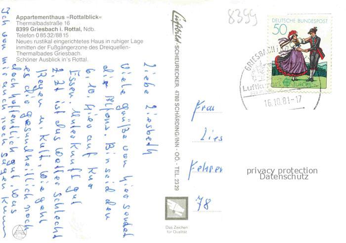 74049588 alte Postkarte Bad Griesbach Rottal Appartementhaus Rottalblick Thermalkurort postalisch gelaufen Erhaltung siehe scans [FriedD77] KatCode: 11110009275124