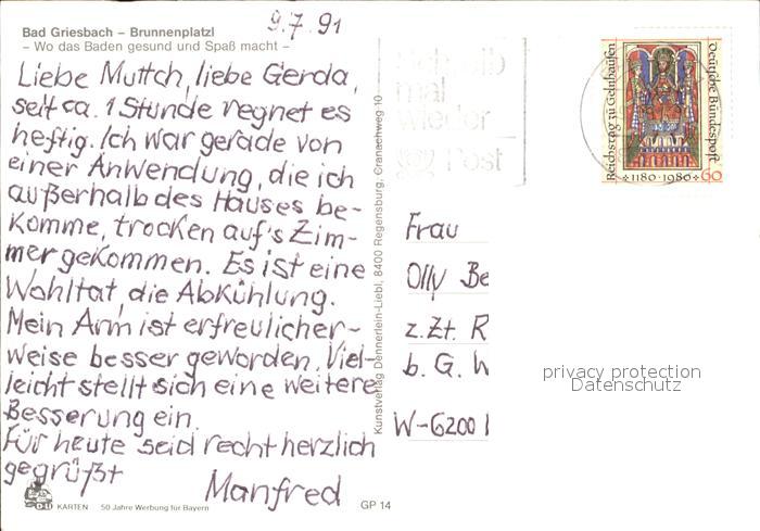 72309493 alte Postkarte Bad Griesbach Rottal Brunnenplatz postalisch gelaufen Erhaltung siehe scans KatCode: 11110009275124