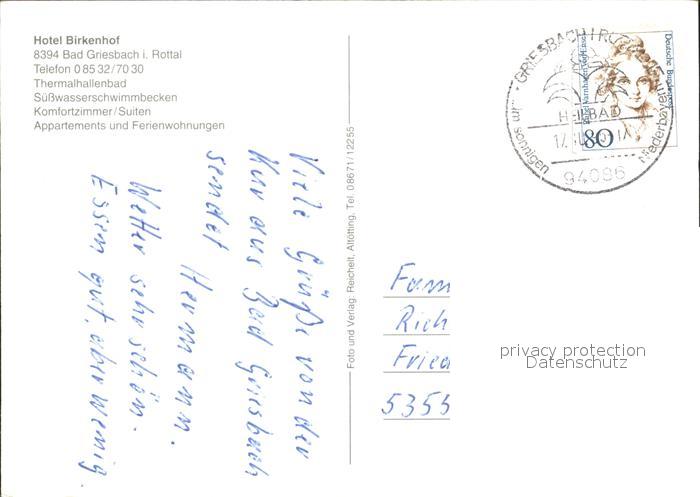 71991945 alte Postkarte Bad Griesbach Rottal Hotel Birkenhof postalisch gelaufen Erhaltung siehe scans KatCode: 11110009275124