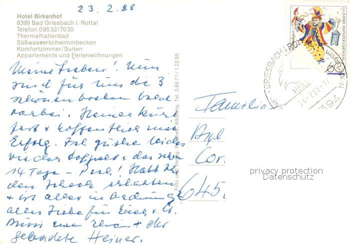 73047523 alte Postkarte Bad Griesbach Rottal Hotel Birkenhof postalisch gelaufen Erhaltung siehe scans [WerneD78] KatCode: 11110009275124