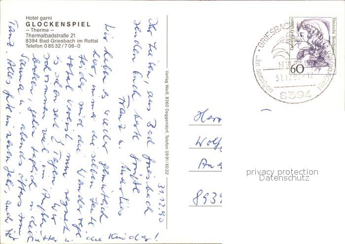 72583417 alte Postkarte Bad Griesbach Rottal Hotel Garni Glockenspiel postalisch gelaufen Erhaltung siehe scans [LiesaD40] KatCode: 11110009275124