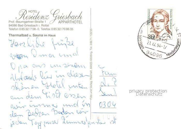 73734645 alte Postkarte Bad Griesbach Rottal Hotel Residenz Apparthotel postalisch gelaufen Erhaltung siehe scans [LiesaD40] KatCode: 11110009275124