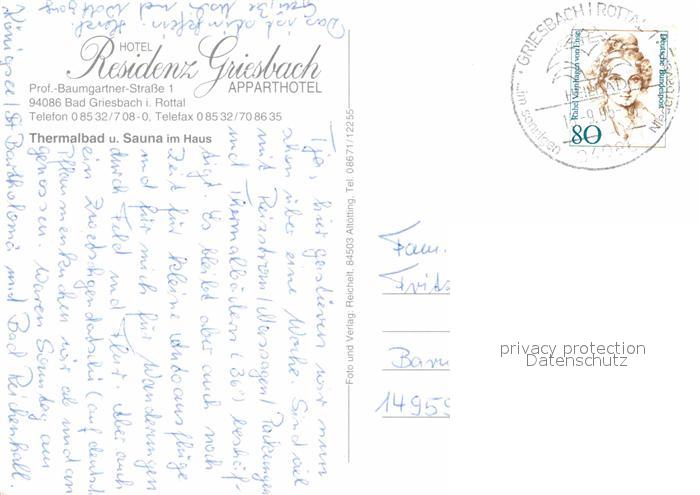 72826439 alte Postkarte Bad Griesbach Rottal Hotel Residenz Restaurant Thermalbad postalisch gelaufen Erhaltung siehe scans [FriedD77] KatCode: 11110009275124