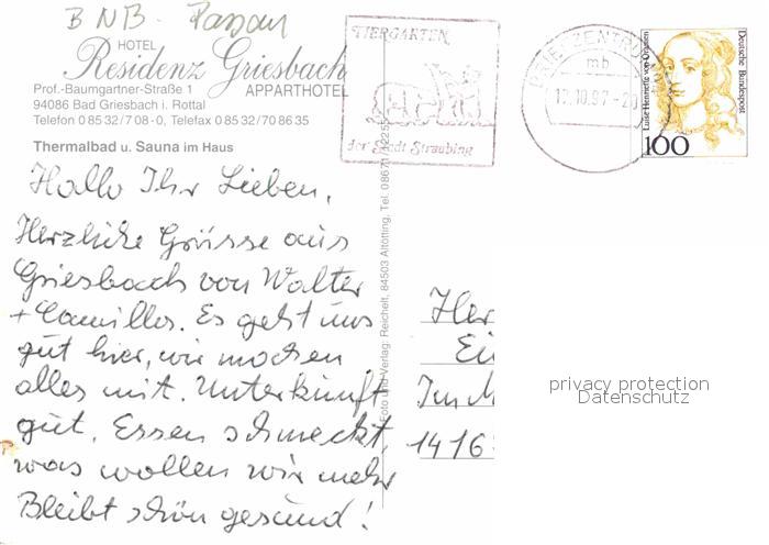 72885614 alte Postkarte Bad Griesbach Rottal Hotel Residenz Restaurant Thermalbad postalisch gelaufen Erhaltung siehe scans [FriedD77] KatCode: 11110009275124