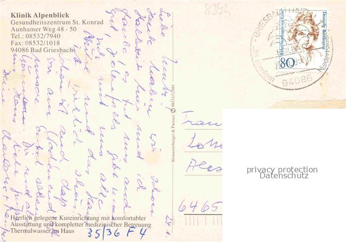 74049573 alte Postkarte Bad Griesbach Rottal Klinik Alpenblick Gesundheitszentrum St. Konrad Hallenbad Restaurant postalisch gelaufen Erhaltung siehe scans [FriedD77] KatCode: 11110009275124