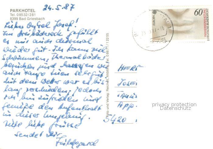 73721700 alte Postkarte Bad Griesbach Rottal Parkhotel Bad Griesbach Hallenbad Kapellchen postalisch gelaufen Erhaltung siehe scans [WerneD78] KatCode: 11110009275124