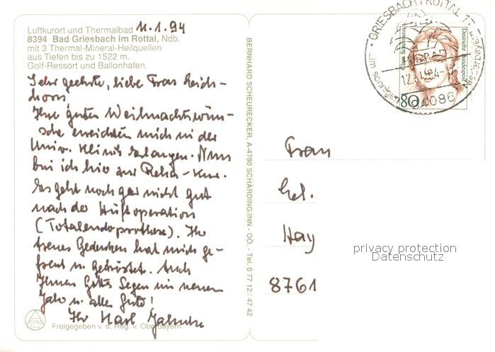 73656396 alte Postkarte Bad Griesbach Rottal Thermalbad Fliegeraufnahme postalisch gelaufen Erhaltung siehe scans [WerneD78] KatCode: 11110009275124