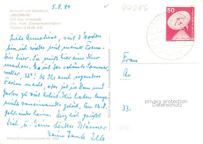 73865044 alte Postkarte Bad Griesbach Schwarzwald Kurhotel und Gaestehaus Adlerbad postalisch gelaufen Erhaltung siehe scans [FriedD77] KatCode: 11110008317126