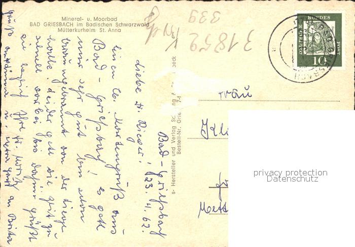 72398790 alte Postkarte Bad Griesbach Schwarzwald Muetterkurheim St Anna postalisch gelaufen Erhaltung siehe scans KatCode: 11110008317126