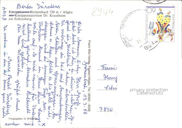 72417625 alte Postkarte Bad Groenenbach Kneippsanatorium Dr Krautheim am Schlossberg Fliegeraufnahme postalisch gelaufen Erhaltung siehe scans KatCode: 11110009778144