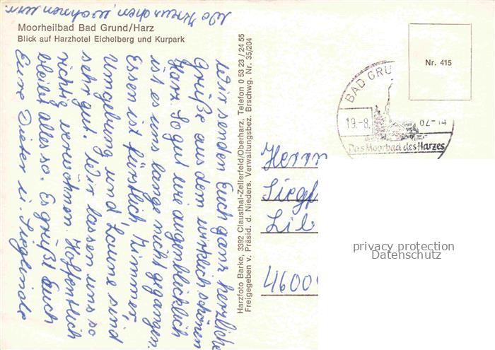 74156347 alte Postkarte Bad Grund Harz Osterode Niedersachsen Harzhotel-Eichelberg Kurpark Hochhaus Wohnhaeuser Wald Luftaufnahme Nadelwald Tal postalisch gelaufen Fliegeraufnahme Erhaltung siehe scans [Karloger] KatCode: 11110003156001