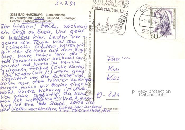 72967852 alte Postkarte Bad Harzburg Fliegeraufnahme Freibad Juluisbad Kuranlagen Burgberg Seilbahn postalisch gelaufen Erhaltung siehe scans [LiesaD40] KatCode: 11110003153002