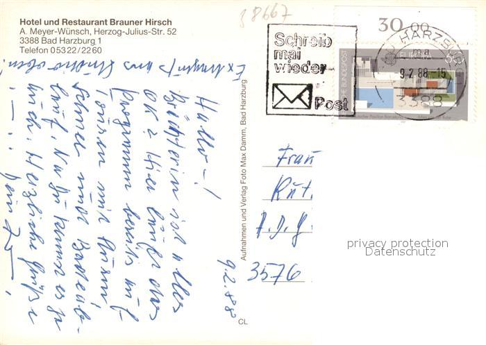 73569994 alte Postkarte Bad Harzburg Hotel Brauner Hirsch Restaurant Zimmer postalisch gelaufen Erhaltung siehe scans [WerneD78] KatCode: 11110003153002