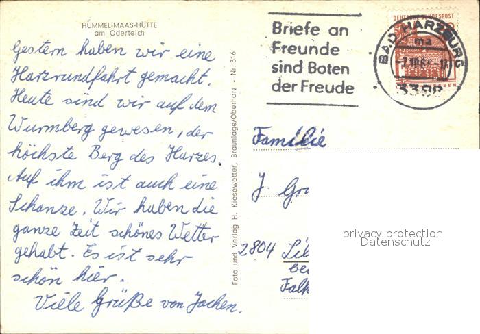 72056290 alte Postkarte Bad Harzburg Hummel Maas Huette am Oderteich postalisch gelaufen Erhaltung siehe scans KatCode: 11110003153002