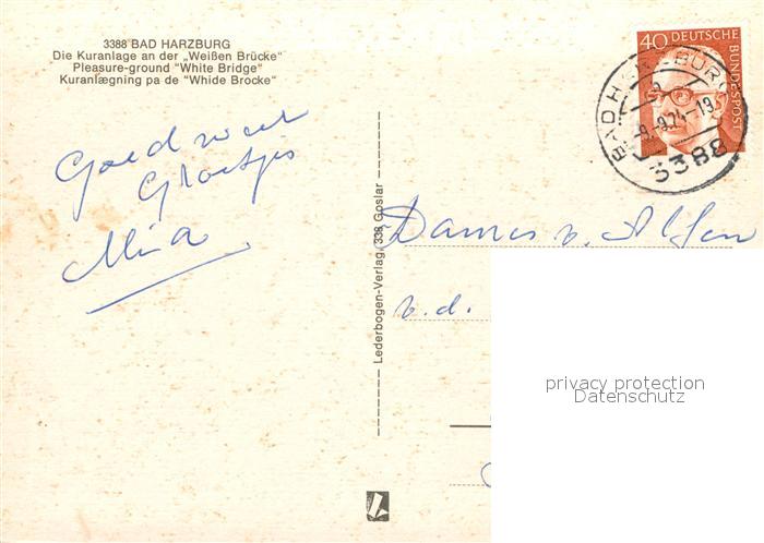 72929912 alte Postkarte Bad Harzburg Kuranlage an der Weissen Bruecke postalisch gelaufen Erhaltung siehe scans [WerneD78] KatCode: 11110003153002