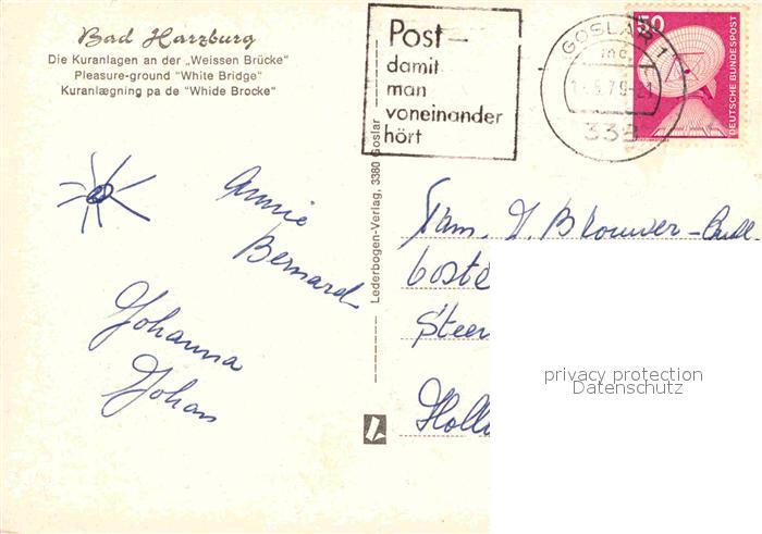 72653703 alte Postkarte Bad Harzburg Kuranlagen an der Weissen Bruecke postalisch gelaufen Erhaltung siehe scans [LiesaD40] KatCode: 11110003153002