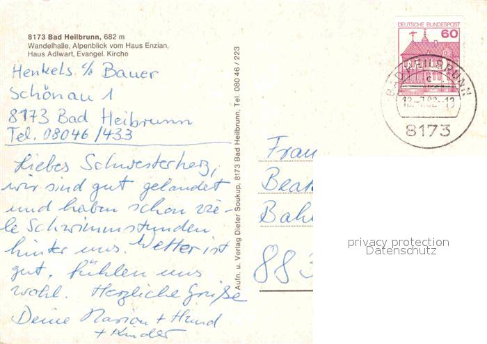 72742206 alte Postkarte Bad Heilbrunn Wandelhalle Haus Enzian Alpenblick Haus Adlwart Ev Kirche postalisch gelaufen Erhaltung siehe scans [FriedD77] KatCode: 11110009173111