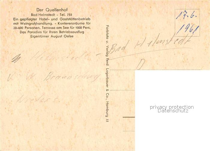 72902610 Bad Helmstedt Hotel Gaststaette Quellenhof Kurpark postalisch nicht gelaufen Erhaltung siehe scans [FriedD77] KatCode: 11110003154010