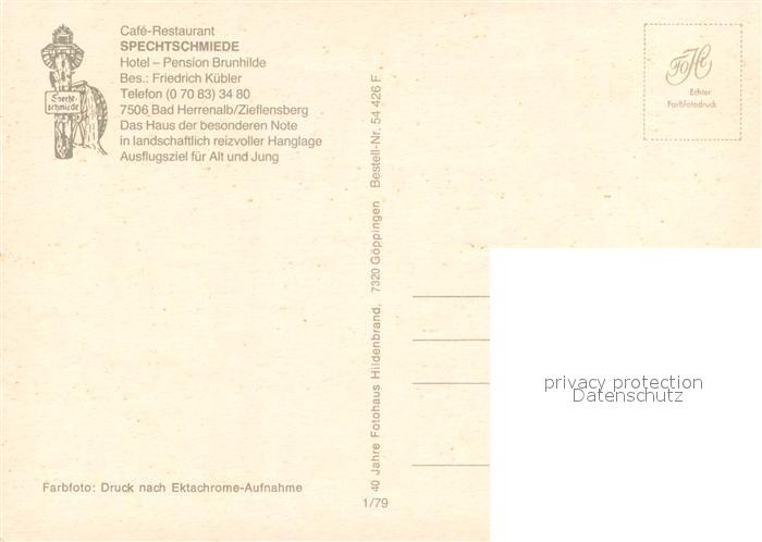 73652459 Bad Herrenalb Cafe Restaurant Spechtschmiede Hotel Pension Brunhilde postalisch nicht gelaufen Erhaltung siehe scans [FriedD77] KatCode: 11110008235033