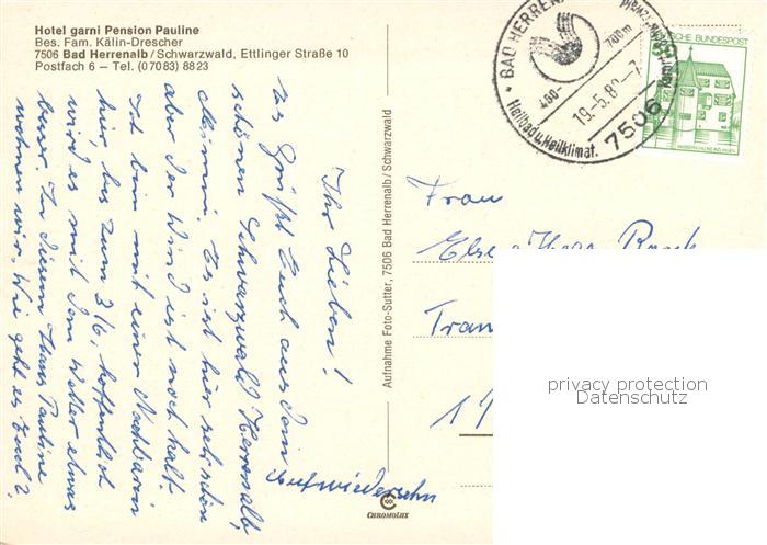 73776034 alte Postkarte Bad Herrenalb Hotel garni Pension Pauline postalisch gelaufen Erhaltung siehe scans [WerneD78] KatCode: 11110008235033