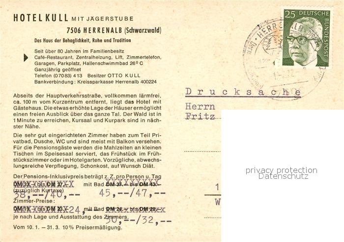 73323234 alte Postkarte Bad Herrenalb Hotel Kull Schwarzwald postalisch gelaufen Erhaltung siehe scans [FriedD77] KatCode: 11110008235033