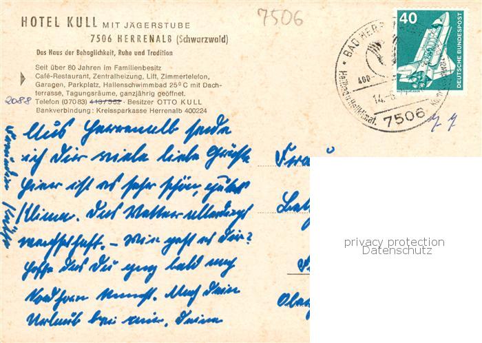 73870773 alte Postkarte Bad Herrenalb Hotel Kull postalisch gelaufen Erhaltung siehe scans [WerneD78] KatCode: 11110008235033
