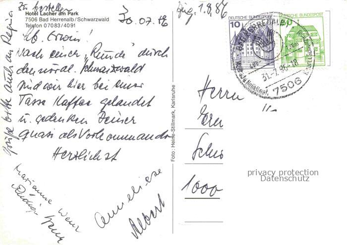 74110945 alte Postkarte BAD HERRENALB Hotel Lacher am Park postalisch gelaufen Erhaltung siehe scans [WerneD78] KatCode: 11110008235033