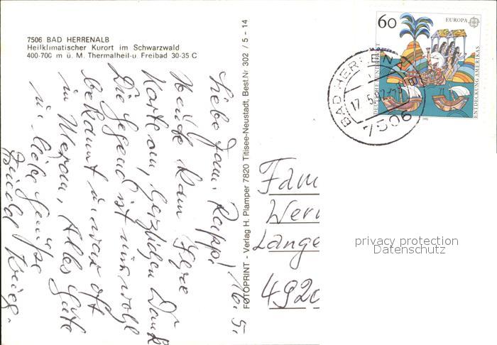 72574183 alte Postkarte Bad Herrenalb Luftaufnahme Kirche Hallenbad Ortsansicht postalisch gelaufen Erhaltung siehe scans [KathaD79] KatCode: 11110008235033