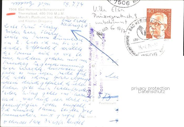 72240318 alte Postkarte Bad Herrenalb Moenchs Posthotel Kloster Schaenke Drogerie Fachwerkhaeuser Thermalbad postalisch gelaufen Erhaltung siehe scans KatCode: 11110008235033