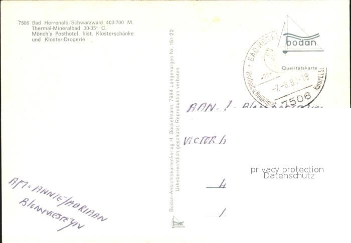 72420973 alte Postkarte Bad Herrenalb Thermal Mineralbad Moenchs Posthotel Klosterschaenke und Kloster Drogerie postalisch gelaufen Erhaltung siehe scans KatCode: 11110008235033