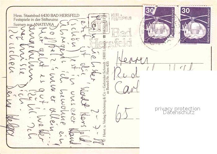 72823448 alte Postkarte Bad Hersfeld Festspiele in der Stiftsruine Szenen aus Anatevka postalisch gelaufen Erhaltung siehe scans [FriedD77] KatCode: 11110006632002