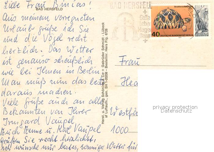 73661579 alte Postkarte Bad Hersfeld Fliegeraufnahme postalisch gelaufen Erhaltung siehe scans [WerneD78] KatCode: 11110006632002