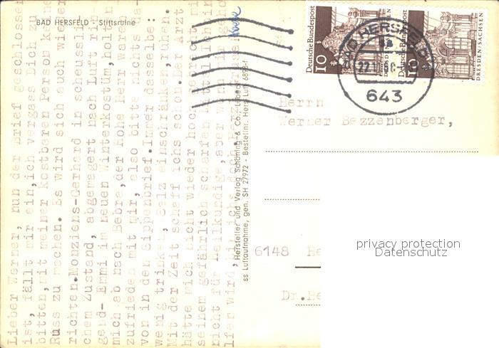 72123616 alte Postkarte Bad Hersfeld Fliegeraufnahme Stiftsruine postalisch gelaufen KatCode: 11110006632002