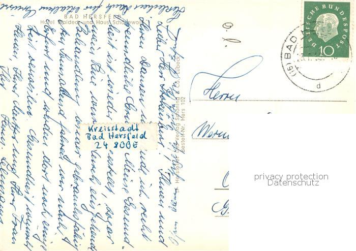 73762701 alte Postkarte Bad Hersfeld Hotel Waldeck und Haus Schoenewolf postalisch gelaufen Erhaltung siehe scans [FriedD77] KatCode: 11110006632002